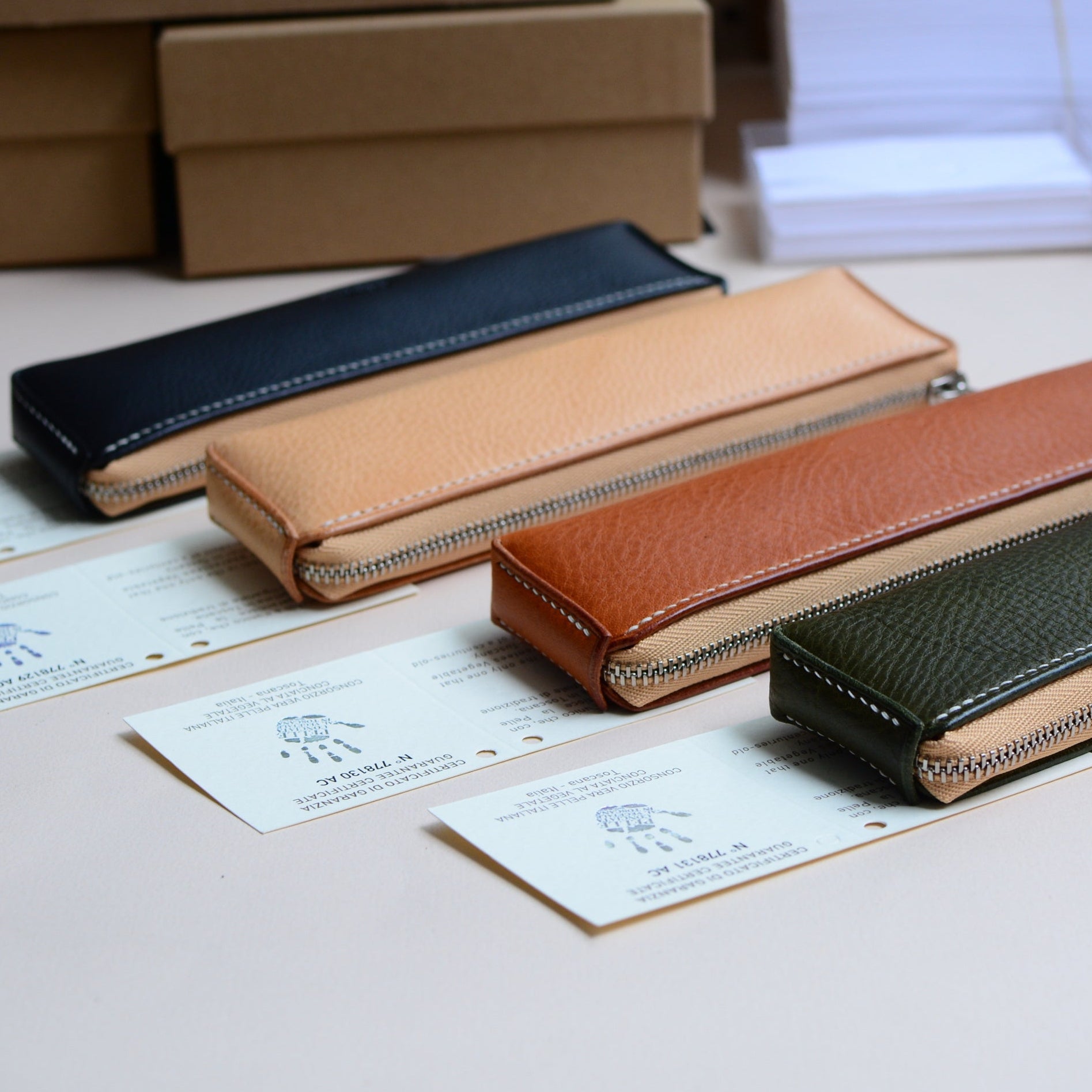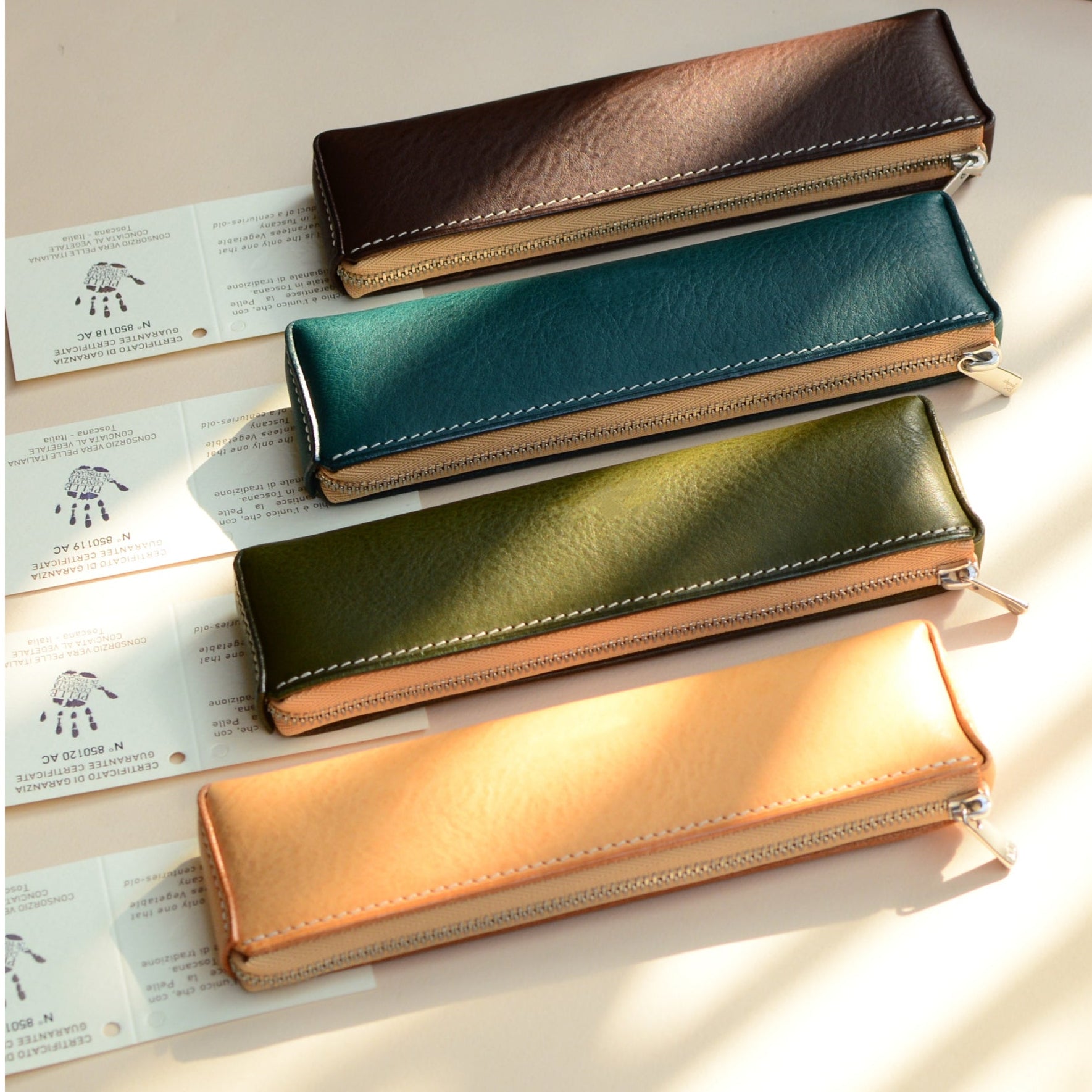 上質なイタリア製タンニンなめし革「ミネルバボックス」を贅沢に使用し、ひとつひとつ手縫いで丁寧に仕上げたコンパクトな本革ペンケース。重さわずか約45gと非常に軽量でありながら、ペンや小物をしっかりと収納できる実用性と上質さを兼ね備えています。日々持ち歩く道具だからこそ、軽さと上質な素材感にこだわりたい。